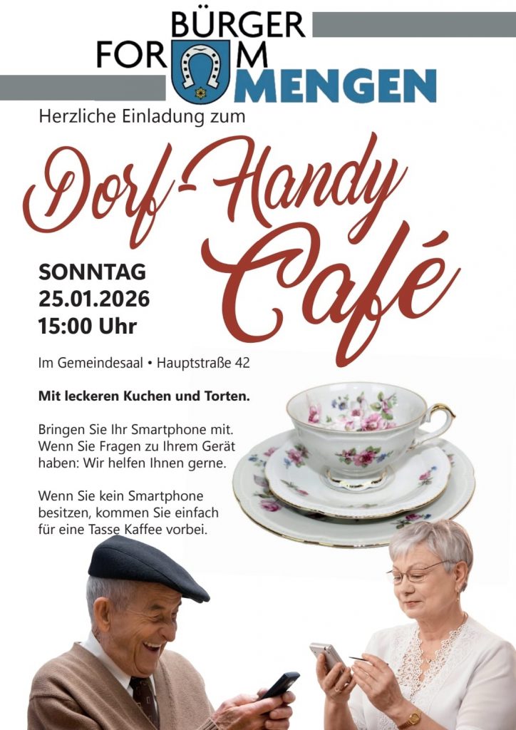 Jan.25So.15:00 Dorfcafe mit Handycafé @ Evangelischer GemeindesaalDorfcafe mit Handycafé @ Evangelischer GemeindesaalJan. 25 um 15:00Dorfcafé im Gemeindesaal, auf vielfachen Wunsch wieder mit Handycafé Wir laden herzlich ein zum Dorfcafé in den Gemeindesaal (Hauptstraße 42, beim Pfarrhaus). Wie immer gibt es leckere, selbstgemachte Kuchen und Torten sowie frischen Kaffee. ALLE sind herzlich willkommen – mit … Weiterlesen →Jan.31Sa.17:00 Aktionstag Jugend – Sportangebot... @ Mehrzweckhalle MengenAktionstag Jugend – Sportangebot... @ Mehrzweckhalle MengenJan. 31 um 17:00 – 19:00Hier können sich Kids nach Herzenslust auspowern – Ihr bestimmt, worauf Ihr Lust habt! Für Kids und Jugendliche ab 9 Jahren – in der Halle und / oder im angrenzenden Gymnastikraum. Bringt Hallenschuhe, Sportklamotten und etwas zu trinken mit, kommt … Weiterlesen → -