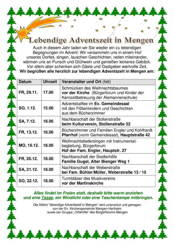 Wir treffen uns vor der Martinskirche, singen und hören Geschichten, wärmen uns am Punsch und genießen leckeres Gebäck. Gemeinsam mit den Kindern der Mengener Kernzeitbetreuung wird der Christbaum vor der Kirche festlich dekoriert. Wir freuen uns, wenn Sie dabei sind. Bitte bringen Sie eine Tasse mit!