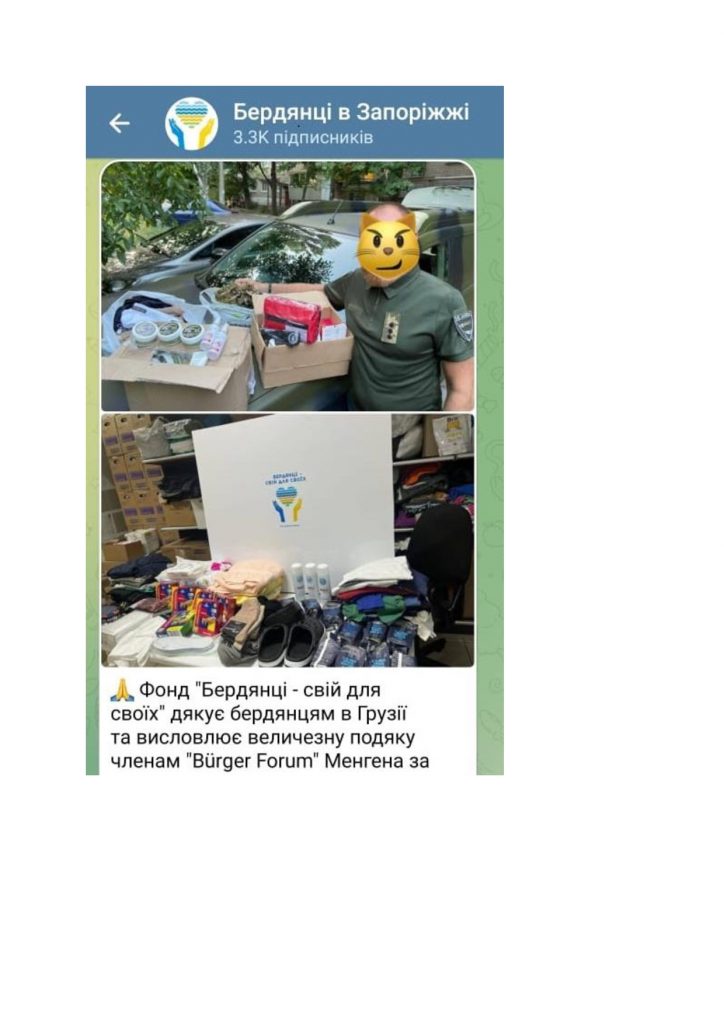 „Die Selbsthilfe-Organisation…für Berdiansker…bedankt sich…beim Bürgerforum Mengen für die Unterstützung und Hilfe. Vielen Dank an unsere wahren Freunde in Deutschland! Wir haben die notwendige Hilfe erhalten für die Soldaten, die vorübergehend in Behandlung sind…“