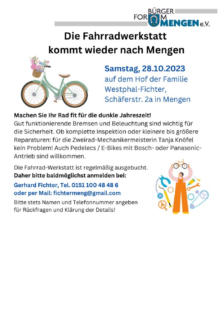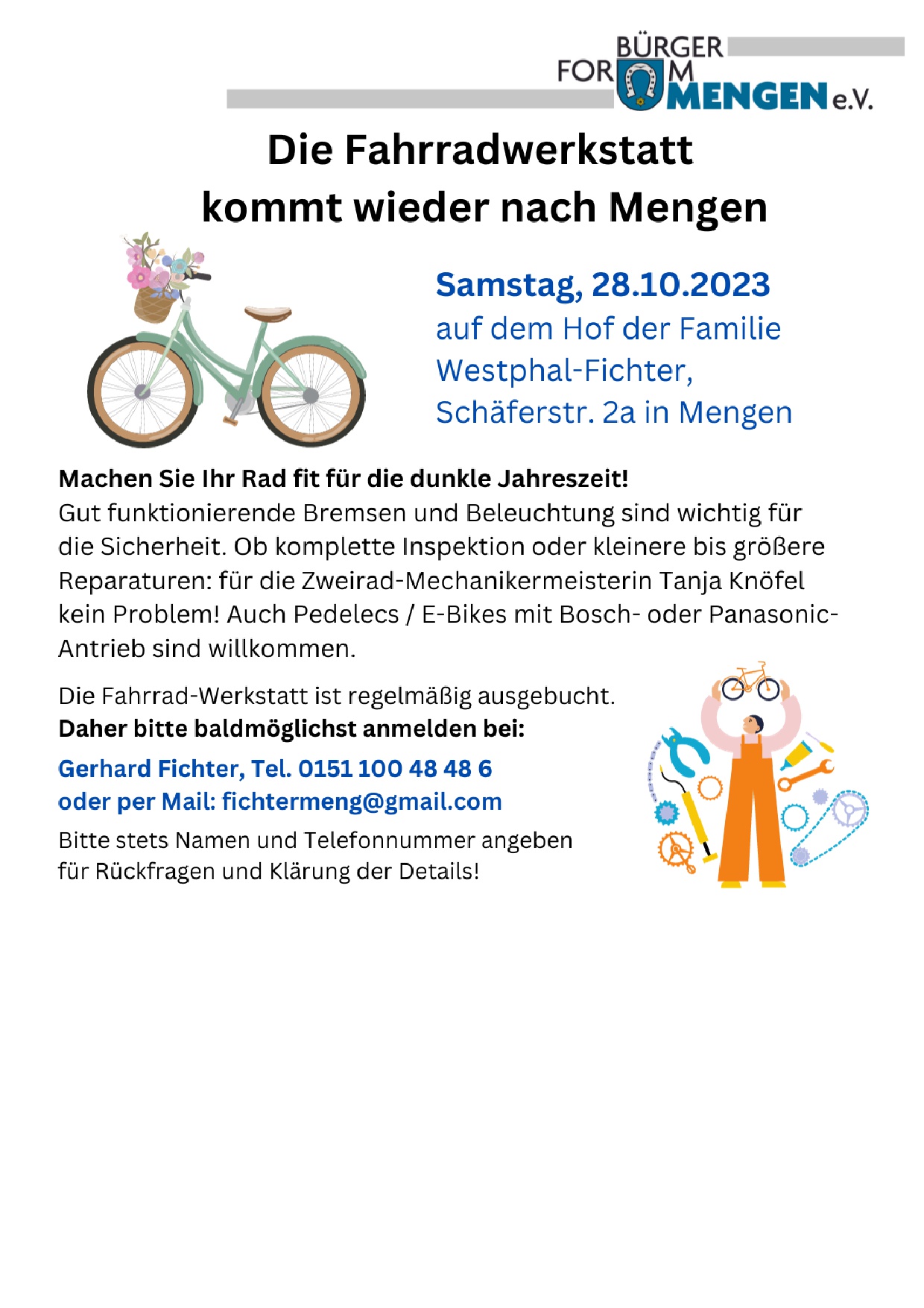 Allen, die ggfs. nicht zum Zuge kommen, empfehlen wir Jonutz´ Fahrradwerkstatt, die seit kurzem in Mengen ihren Service anbietet: Für Fahrrräder, E-Bikes, mit Hol- und Bringservice, Termine nach Absprache.
