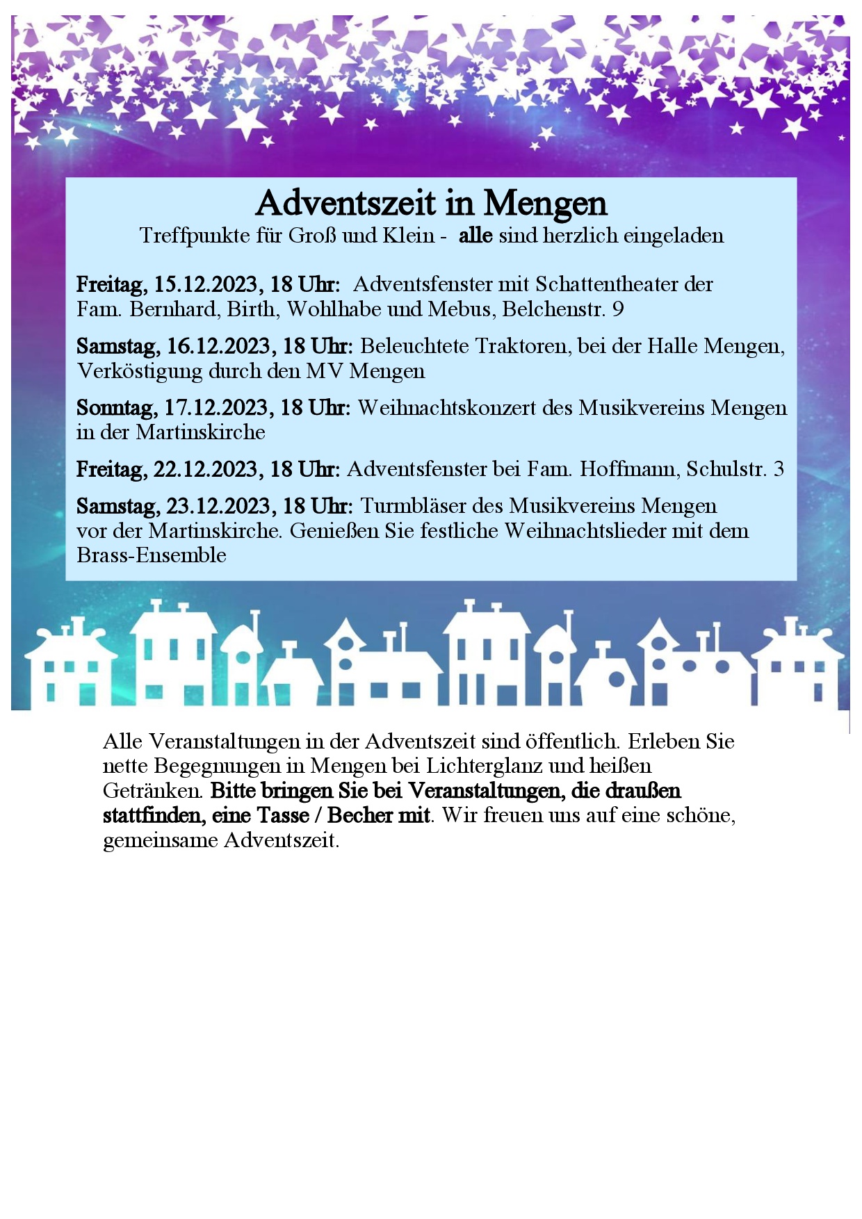 Nov.28Fr.18:00 Christbaum schmücken vor der Eva... @ Evangelische MartinskircheChristbaum schmücken vor der Eva... @ Evangelische MartinskircheNov. 28 um 18:00Gemeinsam mit allen Teilnehmern schmücken wir den Christbaum neben der Martinskirche in Mengen. Wir singen Lieder, lesen eine Geschichte und hängen Weihnachtsdeko in den Baum. Wer möchte, kann gerne etwas dazu beisteuern. Im Anschluss gibt es Gebäck und Kinderpunsch. Wir … Weiterlesen → -
