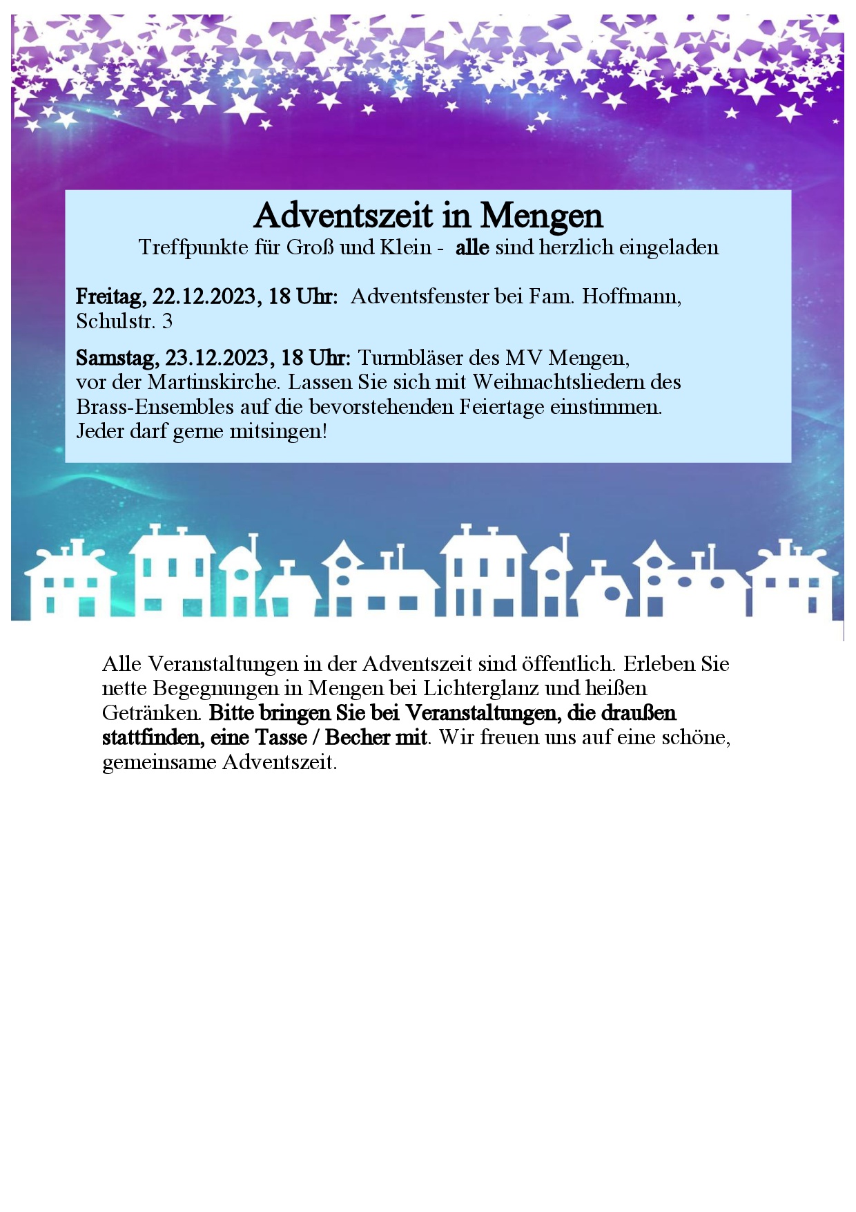 Die letzten beiden Veranstaltungen der „Lebendigen Adventszeit“ bieten Ihnen vor Weihnachten noch folgende Möglichkeiten der Begegnung: