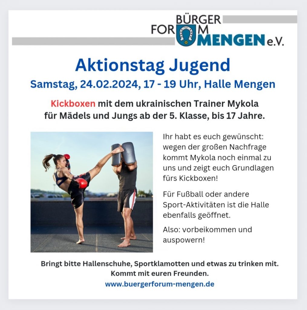 Im Sommer 2023 war der ukrainische Kickbox-Profi und Trainer Mykola zu Gast bei unserem Sportangebot. Seine Tipps und Tricks beim Kickboxen fanden großen Anklang und der Wunsch nach einem erneuten Kickbox-Angebot wurde an uns herangetragen. Ganz kurzfristig hat uns Mykola nun für den Samstag erneut zugesagt und gerne bieten wir allen interessierten Kids noch einmal die Möglichkeit, das Kickboxen unter professioneller Anleitung auszuprobieren. Zusätzlich ist die Halle und der angrenzende Gymnastikraum auch für alle anderen Sportbegeisterten geöffnet, die sich gerne wieder auspowern möchten. Bringt Hallenschuhe, Sportklamotten und etwas zu trinken mit, kommt mit euren Freunden! Wir freuen uns auf euch