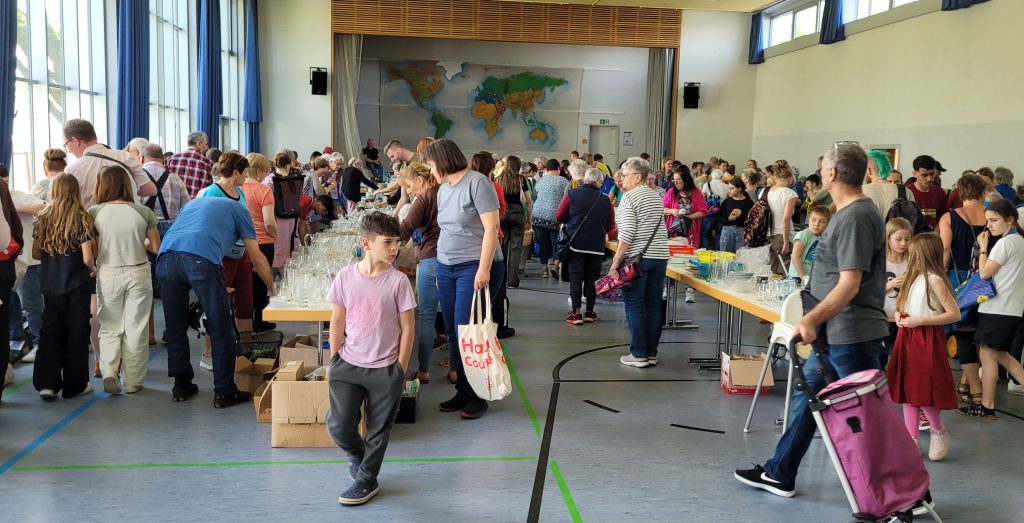 Schon nach einer knappen Stunde hatte ein Großteil der gespendeten Sachen wieder neue Besitzer, die teils mit leuchtenden Augen die Halle wieder verließen. Selbst wenn es für uns ein anstrengender Tag war, so hat es doch allen großen Spaß gemacht. Von den Besuchern kam auch sehr viel Lob für diese Aktion, die ganz im Zeichen der Nachhaltigkeit steht. Ein herzliches Dankeschön geht an alle ehrenamtlichen Helfer vor und hinter den Kulissen, die sich teils über den ganzen Tag engagiert haben. Dank auch an alle, die uns mit einer Kuchenspende unterstützt haben. Auch für den gespendeten Kartoffelsalat fürs Mittagessen der Helfer sagen wir herzlich Danke. Ein dickes Dankeschön geht an die Gemeinde Schallstadt und vor allem an die Hausmeister Olaf Jost und Walter Bronner für die gewohnt zuverlässige Unterstützung!!!