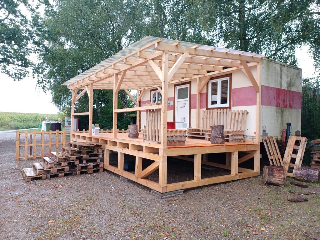 Ebenso in den Ferien hat sich das Äußere des Jugendwagens deutlich verändert. In der ersten Schulferienwoche hat die Firma Dufner Holzbau eine große, überdachte Terrasse vor den Jugendwagen gebaut. Dafür möchten wir Carsten Dufner und seinem Team VIELEN DANK sagen. Ebenso den Jugendlichen, die die Bauarbeiten tatkräftig unterstützt haben – VIELEN DANK.