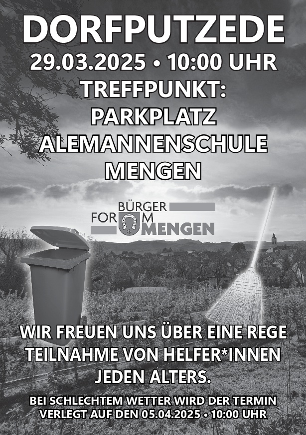 Seit vielen Jahren führt das Bürgerforum immer im Frühjahr eine Dorfputzede durch. Jetzt wird es wieder Zeit, unser Dorf „auf Hochglanz“ zu bringen! Alle, die dabei sein wollen, treffen sich am 29.3. um 10 Uhr beim Parkplatz an der Schule / Halle in Mengen. Wir geben dort die Müllsäcke aus und teilen die Gebiete auf. Die Helfer der Dorfputzede können dann – entweder direkt am Samstag, oder im Laufe des Wochenendes – bei einem Spaziergang auf ihrer Strecke den Müll sammeln und den zugeknoteten Müllsack auf die bereit gestellten Anhänger werfen. Wir empfehlen, Arbeitshandschuhe mitzubringen. Bei schlechtem Wetter wird die Putzaktion 1 Woche verschoben, auf den 5.4.2025.